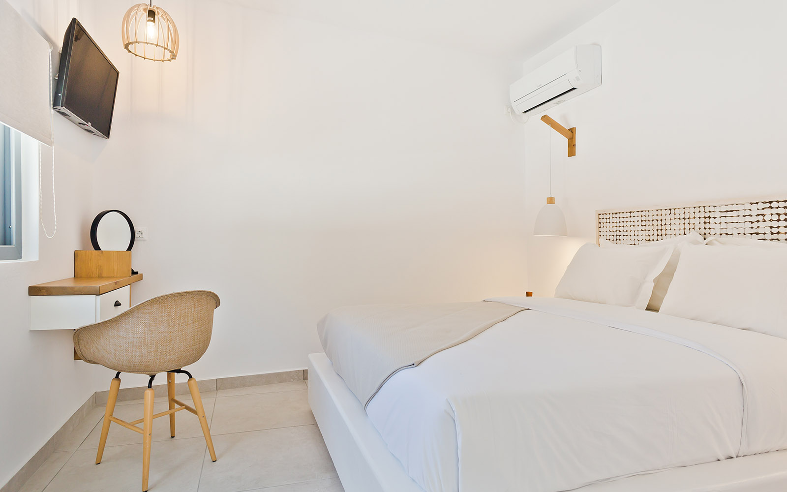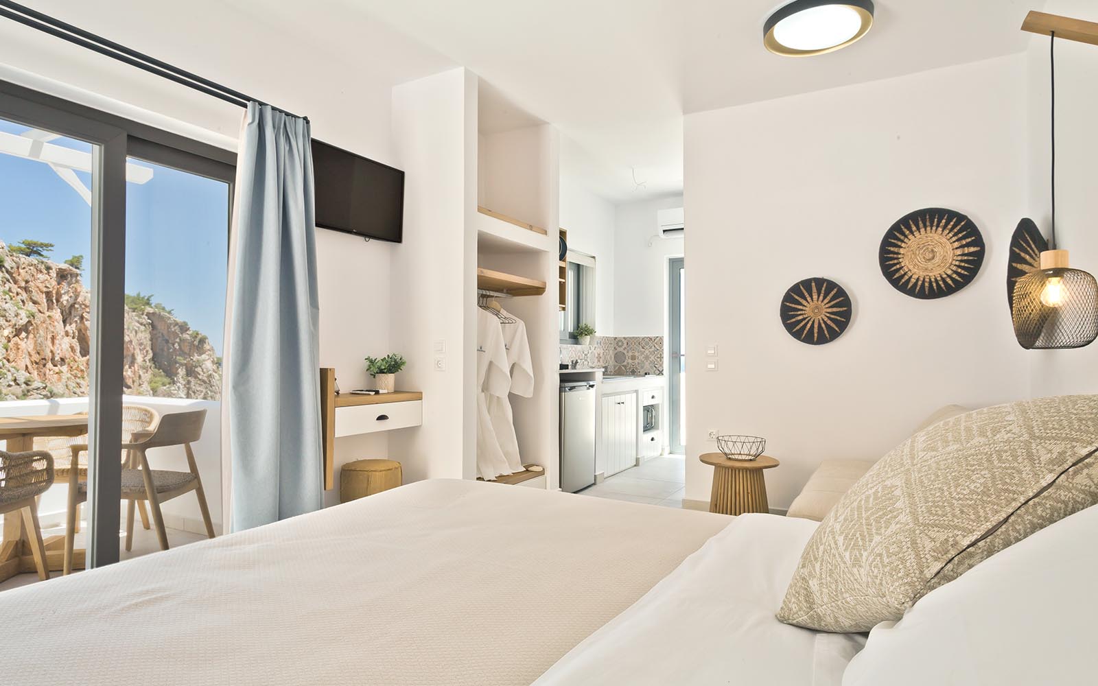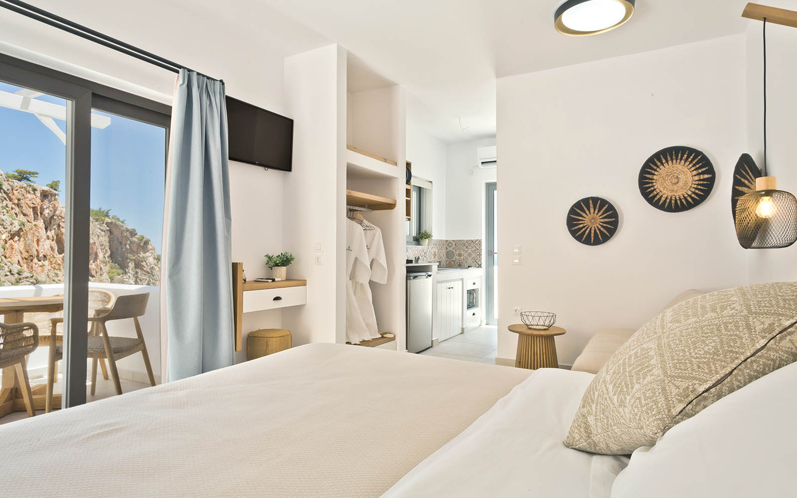 Beautiful design with modern furnishings including a glamorous seasonal outdoor pool / jacuzzi (max 27°C). Each Suite is 45 sq meters and comes with a terrace offering sea and mountain views. Our Suites include separate bedroom with 1 queen size bed, living room with 2 sofa beds, kitchen and bathroom. Capable of accommodating two adults and two kids.